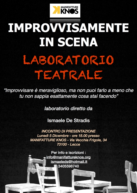 Lunedì 5 dicembre, con inizio alle ore 18, presso le Manifatture Knos di Lecce, sarà presentato il laboratorio teatrale “Improvvisamente in scena”, diretto da Ismaele De Stradis.